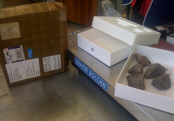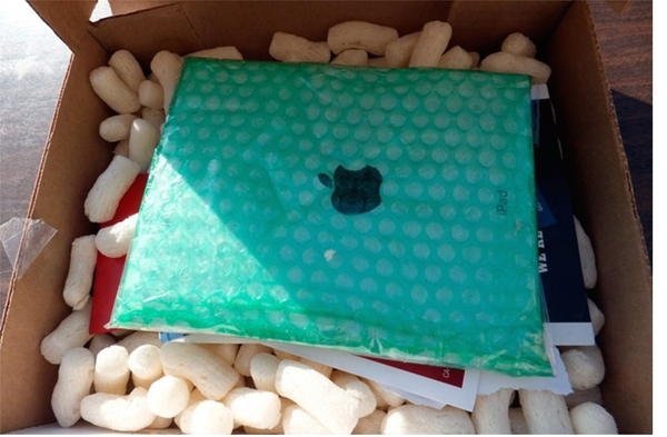 А вот здесь мошенники проявили больше смекалки, и вместо iPad вложили в посылку керамическую плитку с логотипом Яблока.
