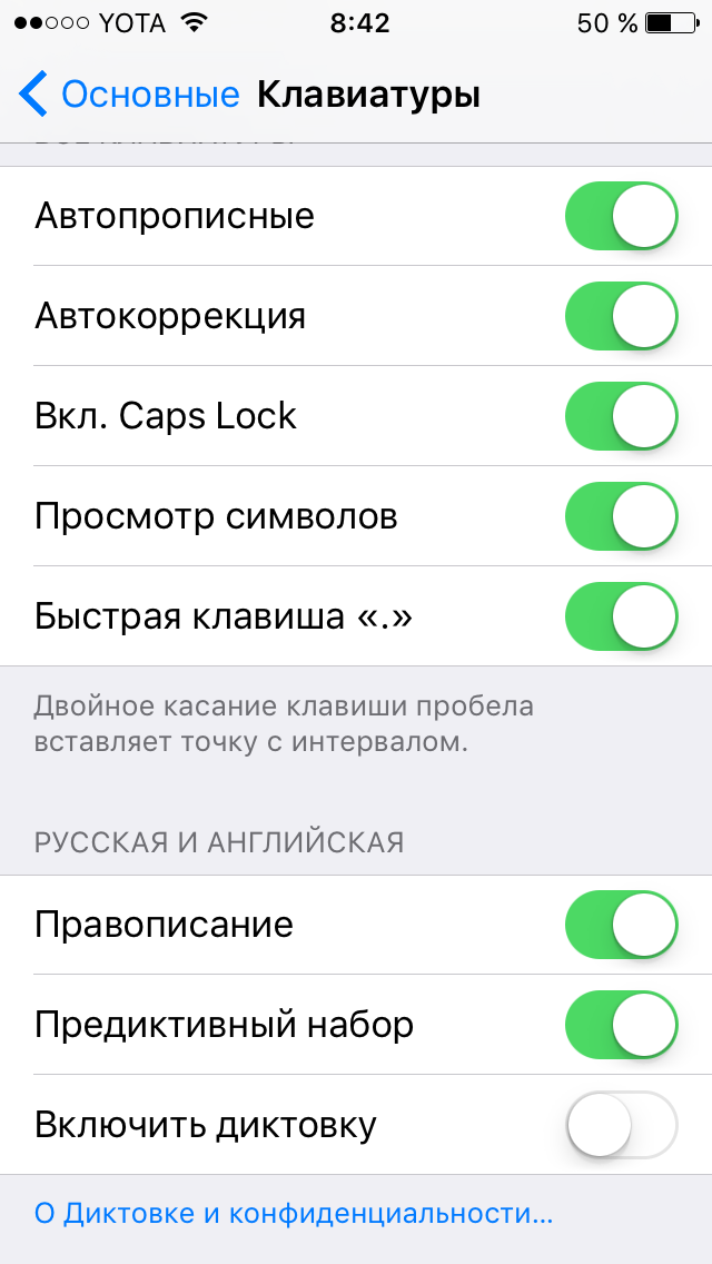 Вот и все: этой простой манипуляции достаточно для того, чтобы кнопка с изображением микрофона не мешала вам быстро набирать и отправлять текст в мессенджерах или электронной почте. Если же вам нужно будет вернуть кнопку на место и воспользоваться функцией диктовки, тогда снова зайдите в Настройки, раздел Основные, выбирайте позицию Клавиатура и переключайте тумблер в активное положение.