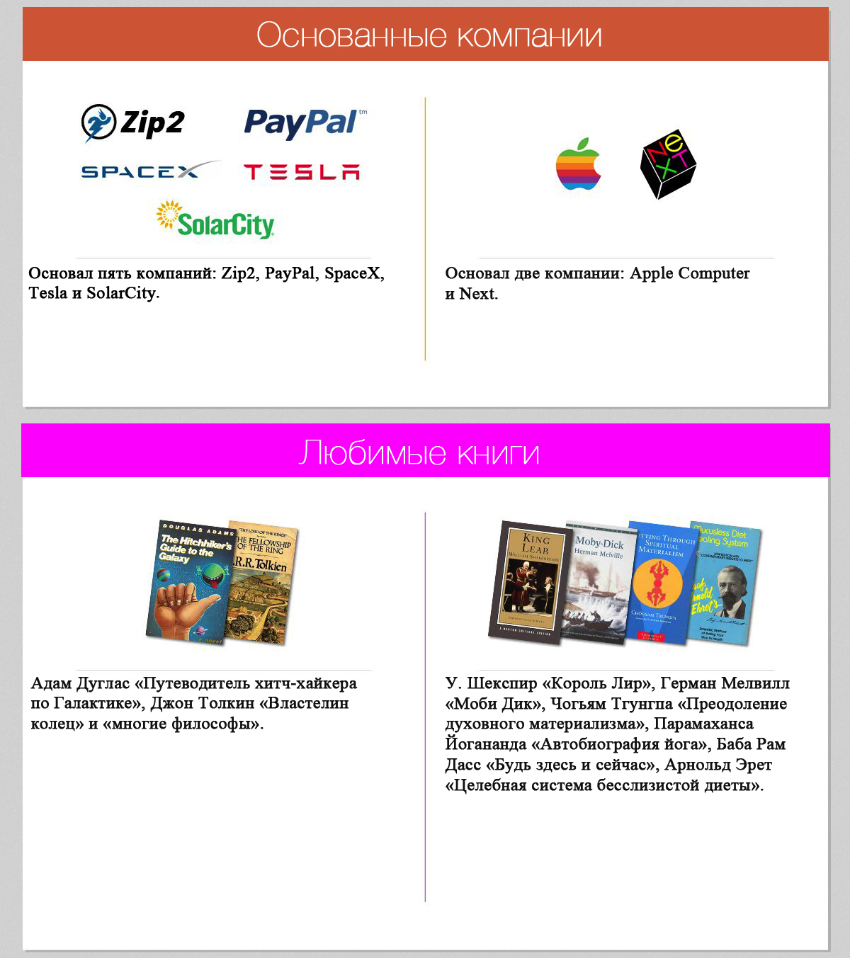 В довершение всего, художник и журналист Майк Нудельман представил наглядную инфографику, которая сравнивает Стива Джобса и Илона Маска. Не обязательно принимать чью-то сторону — это просто интересные данные.
